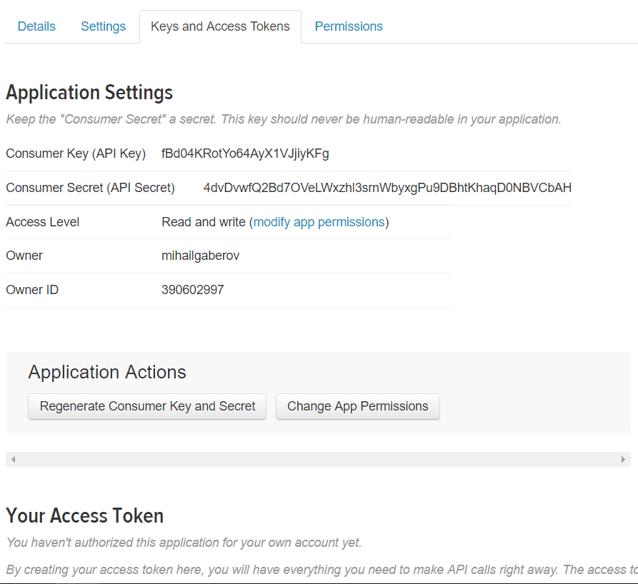 In order to be able to consume the , we need to obtain four things: consumer key, consumer secret, access token and access token secret. These are simple strings as you will see in a moment. The only thing you need to do, to get these, is a Twitter account. Once you got it, go to and create new app.