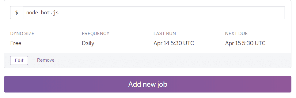 You will be able to use it for free if you have entered your credit card details. In our case we will use it to run the bot at certain time which means that it will execute the logic for searching and sending messages that we implemented. We do this by adding a job to be run by the scheduler like so: