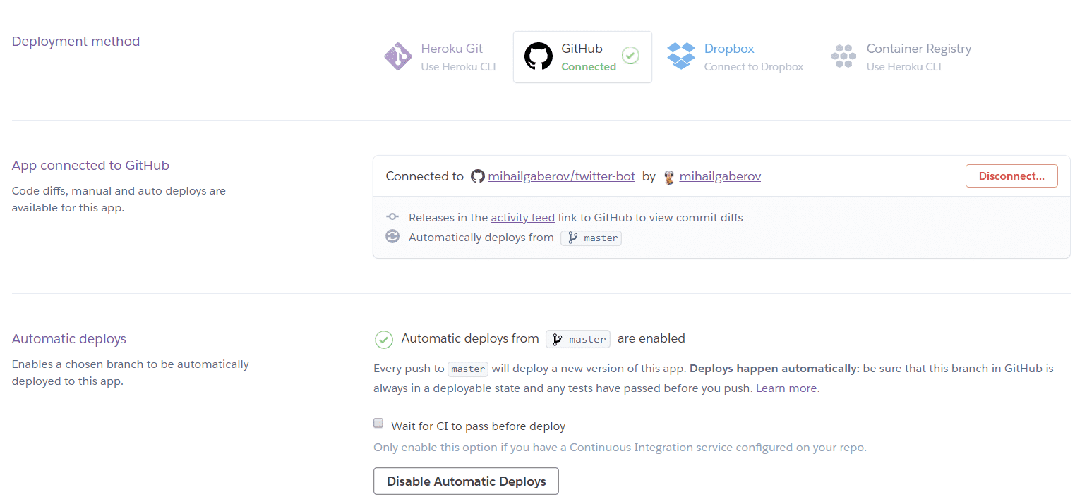 With that done you should have your bot deployed to Heroku. If you have enabled the automatic deploys, every time when you commit something to your GitHub repository a new deploy will be triggered.