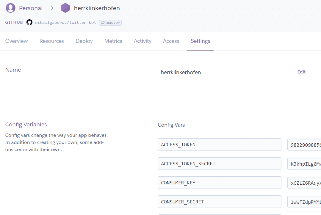 After you create your new app you should be able to find the “Settings” tab. Go there and click “Reveal Config Vars” button. Here you can enter your configuration variables (you remember — your consumer and API keys).